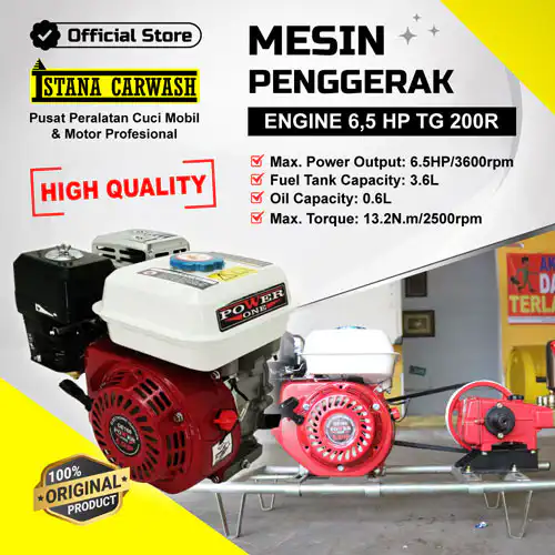 Mesin penggerak (engine bensin) berfungsi sebagai sumber tenaga utama untuk berbagai kebutuhan, seperti penggerak kompresor, mesin power spray, dan alat cuci mobil atau motor.