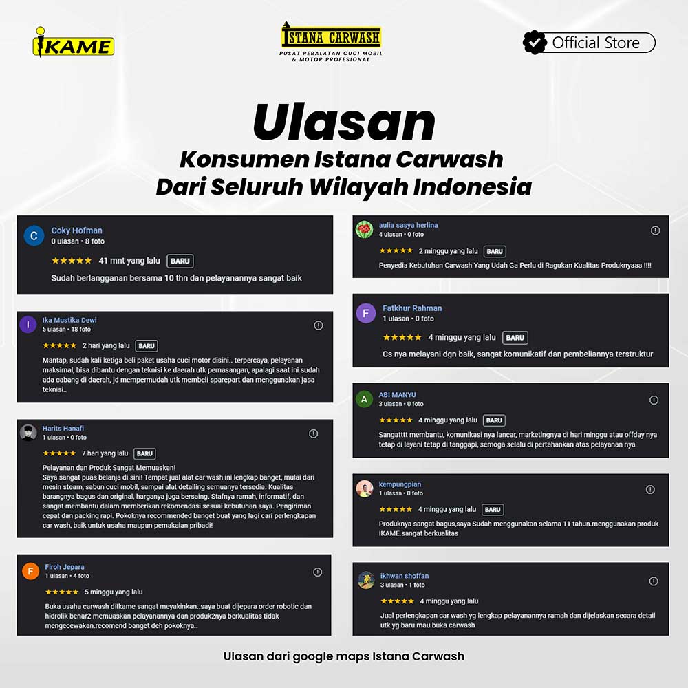 Dengan pengalaman lebih dari 15 tahun, Istana Carwash menghadirkan produk berkualitas industri, bergaransi resmi, dan telah digunakan ribuan pengusaha di seluruh Indonesia. Siap kirim, pasang, dan digunakan di seluruh wilayah Nusantara.