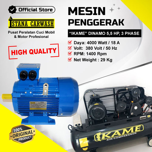 Ikame Dinamo 5.5 Hp 3 Phase, Mesin penggerak (dinamo listrik) berfungsi sebagai sumber tenaga utama untuk berbagai kebutuhan, seperti penggerak kompresor, mesin power spray, dan alat cuci mobil atau motor.